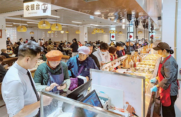 游客們在四川博物院食堂內(nèi)排隊(duì)選菜。